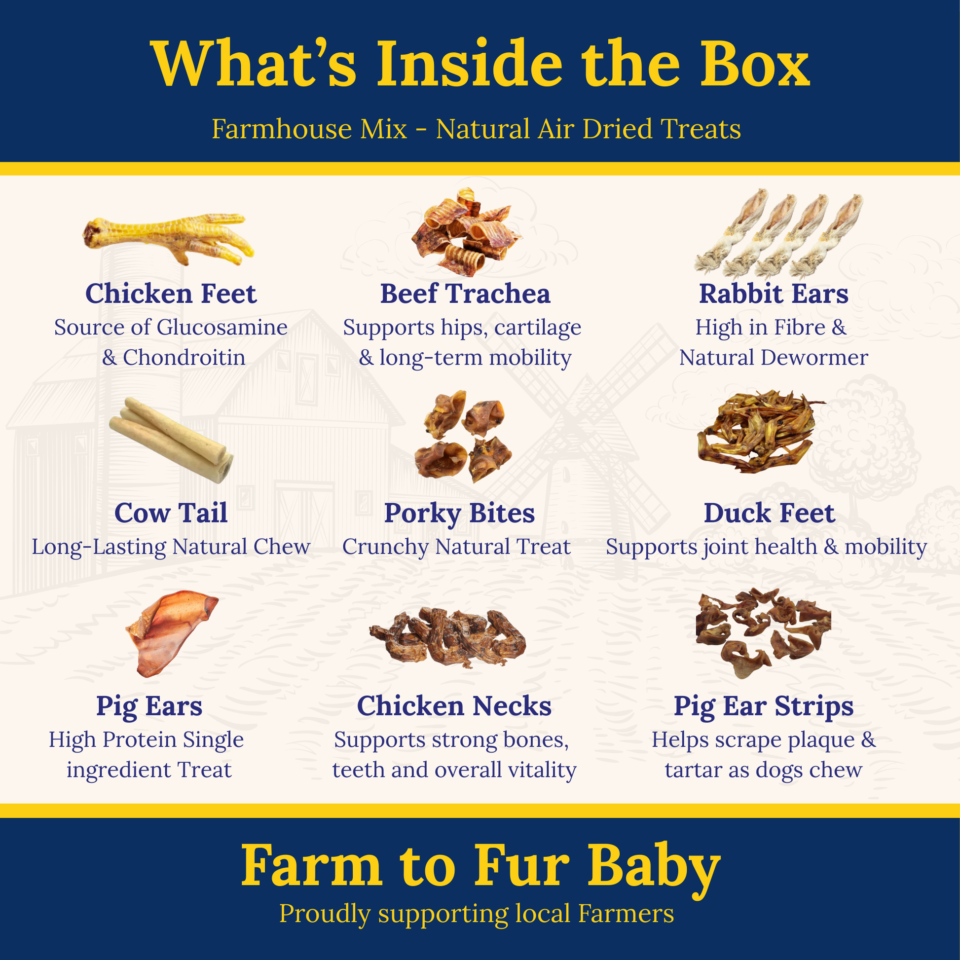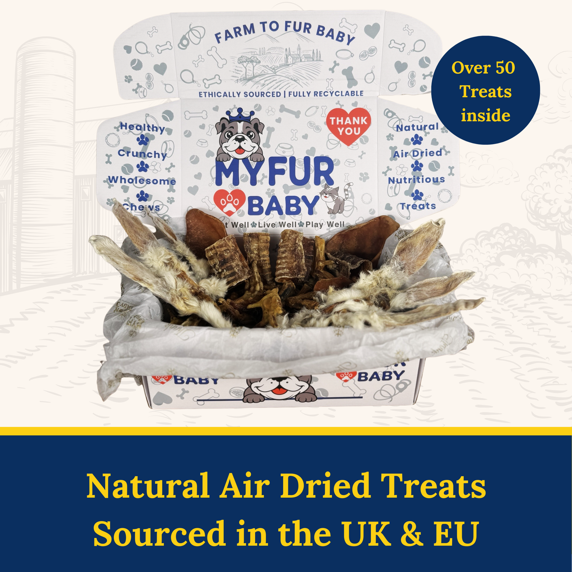 Treat your dog to a variety of natural, air-dried chews with our 50pcs Treat Box – packed with responsibly sourced, high-protein snacks that support dental health, joint care, and chewing satisfaction.