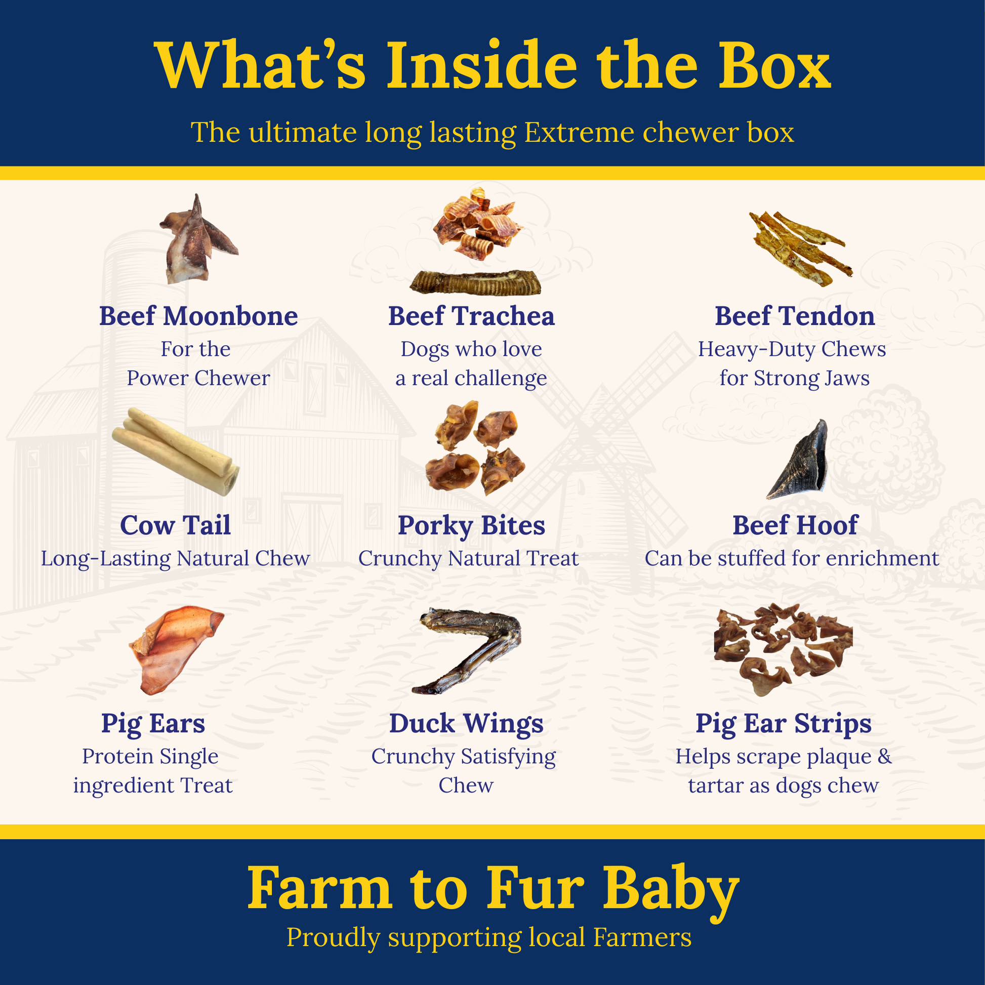 Give your dog the ultimate chewing experience with the My Fur Baby Ultimate Long-Lasting Chewer Box — a premium selection crafted for dogs who love to chew, explore and stay busy. Every chew in this box is single-ingredient, naturally air-dried and fully traceable back to UK & EU farms, aligning with our Farm to Fur Baby ethos of honesty, quality and responsible sourcing. This box is packed with durable chews of varying textures and chewing strength, from beef tendon and trachea to moon bone, pig ears, cow tail and crunchy duck wings. Designed to keep dogs engaged for longer, these chews offer natural stimulation while supporting healthy teeth and gums through regular chewing. No artificial colours, flavours or additives — just real, natural chews your dog will genuinely enjoy.